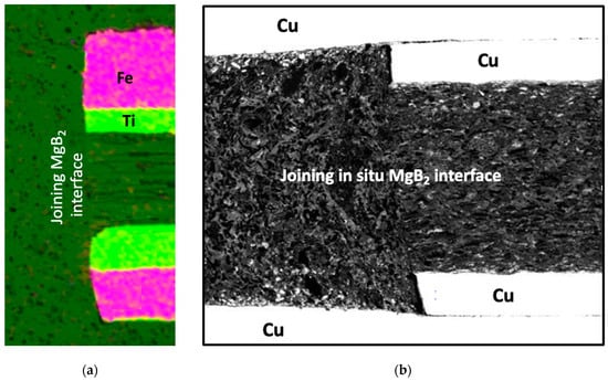 It was reported in the literature [] that ex situ and in situ samples sintered at 900 °C for 24 h show similar Jc(0 T, 20 K) values, indicating that exposure of the in situ joint in the presence of ex situ wires is a correct approach to the manufacture of superconducting joints. However, the Jc value in the presence of an external magnetic field is superior for the ex situ wires; this is less important for the joints, which are normally shielded from the magnetic field of the application electromagnet, such as MRI magnets. Clear evidence for strongly connected ex situ MgB2 polycrystalline bulks fabricated by solid-state self-sintering (at 900 °C) [] formed a basis for planning the sintering of the researched joints at 900 °C for 30 min and cooling them to 650 °C to allow residual magnesium vapour to penetrate the residual interfacial nonuniformities (Figure 2).