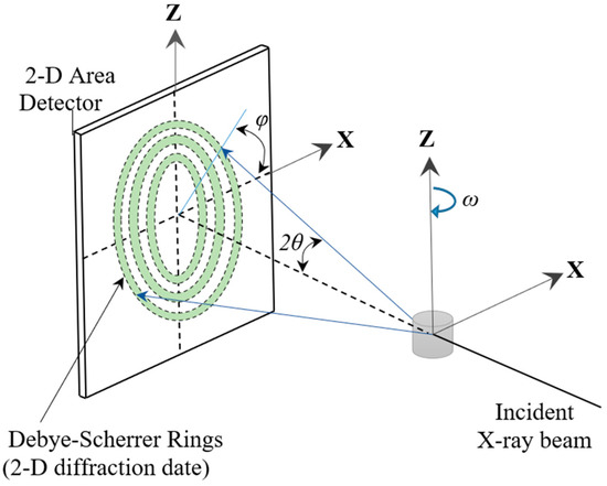 Schematic diagram for synchrotron X-ray diffraction (adapted from [23]). The X-ray beam incident to the sample diffracts at an angle 2θ. The diffracted Debye rings are captured by the 2D area detector, and the results are saved as 2D images.