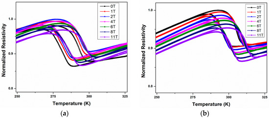 It can be observed from the M (H) curves of BMS220 and BMS222 (Figure 9a,b) that the magnetization decreased with an increase in temperature. BMS222 had higher values of magnetization compared to BMS220, where the maximum magnetization for both BMS220 (42 emu/g) and BMS222 (49 emu/g) was observed at 260 K and 140 kOe. The curve for BMS220 (Figure 12a) had two distinct peaks of ~8.5 and 9.5 J/kg K at 288 and 306 K, respectively. In contrast, a single peak at 318 K was observed in curve for BMS222 (Figure 12b). The presence of two distinct peaks at different temperatures for BMS220 is additional confirmation that the structural phase transition (at 288 K) and magnetic phase transition (at 306 K) occur at different temperatures. The structural phase transition temperature for BMS220, determined by the change in resistivity, was 288 K. These values are consistent with the first peak observed in the temperature-dependent magnetic entropy change observed in Figure 12a. The curve for BMS220 also indicates that both martensite and austenite are ferromagnetic, and austenite becomes paramagnetic at 306 K. In BMS222, a coupled magneto-structural phase transition around 318 K resulted in a value of more than twice that of BMS220. However, the broader temperature range for the entropy change in BMS220 presents an opportunity to expand the temperature range where the magnetocaloric effect is present. The lower symmetry in the crystal structure of martensite in Ni–Mn–Ga alloys improves the magneto-structural anisotropy [37], which makes magnetization saturation easier in the more symmetric crystal structure of austenite [38].