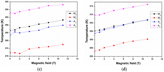 To determine the martensitic transformation temperatures, the resistivity as a function of temperature and magnetic field (Figure 11a for BMS220 and Figure 11b BMS222) was used. The martensitic transformation temperatures were determined using the point of inflection of cooling and heating cycles, and the temperatures replotted as a function of the magnetic field in Figure 11c,d to demonstrate the effect of the application of magnetic field on the transformation temperatures for BMS220 and BMS222, respectively. At all fields, the transformation temperatures of BMS222 were higher than those of BMS220. Also, the trend demonstrates an increase in the transformation temperature with the increasing applied field, with the effect of the field stronger for the BMS222 ribbons, opening the way for more control.