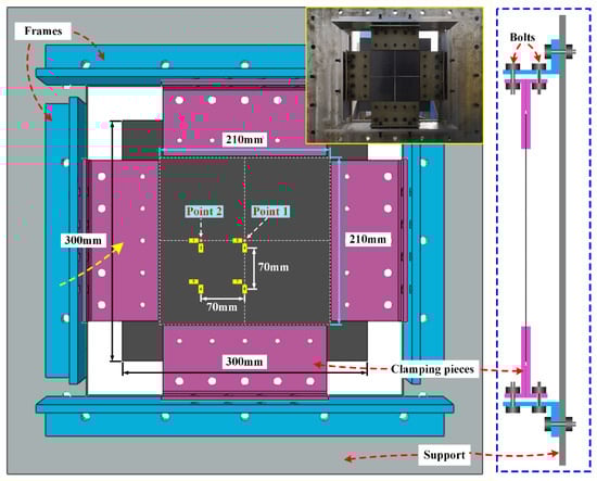 The CFRP composite specimens tested in the ballistic impact tests were made of T700/epoxy resin M10R laminated plates. The laminated plates were prepared to consist of 16 plies with two types of stacking sequences ([0/90]8 and [0/90/+45/−45]2S), and each panel was molded in one shot to produce a nominal fiber volume fraction of 58%. All specimens were prepared with a size of (300 × 300) mm2 by using water jet cutting to avoid initial damage as much as possible during processing. Figure 1 shows the preloading fixture assembly, which consists of eight steel clamping pieces, four thick steel frames, and an extensive steel support. Each side of the specimen was clamped by two clamping pieces, thus leaving a 210 × 210 mm2 free impact zone. A set of eight strain gauges was affixed to the rear surface of each panel, serving a dual purpose: recording in-plane strain histories during impact and providing pre-strain control feedback prior to impact. With the support of these strain gauges, the specific pre-strain could be accurately applied by adjusting the bolts connecting the clamping pieces with the frames before the impact tests. In the present work, a series of ballistic impact tests were carried out under different preloads (0 με, 500 με, and 1000 με) and impact velocities (50 m/s, 70 m/s, and 90 m/s). In addition, two impact positions (point 1 and point 2) were predetermined for the ballistic tests in which point 1 was located in the center of the target and point 2 was 70 mm apart from point 1 in the horizontal direction, as shown in Figure 1. For each loading condition, at least three valid tests were performed. More than 120 pieces of CFRP laminated plates were consumed in the ballistic tests.