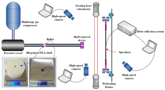 Figure 2 illustrates the one-stage compressed gas gun system used for the high-speed impact tests for preloaded CFRP laminated plates. The gas gun system comprised a pressure vessel with a volume of 0.2 m³ and a 6.8 m long gun barrel with an inner diameter of 80 mm. As projectiles, steel spheres with a diameter of 10 mm and a corresponding mass of 4.05 g were chosen. Specially designed 3D-printed PLA shells were used to support the projectiles and were accelerated by compressive air in the gun barrel during the impact test, contributing to the control of the attitude and velocity of projectiles. Two high-speed cameras were positioned in front of the CFRP laminated plate for specific purposes: one camera was dedicated to recording the impact position, while the other was utilized to measure velocity. In addition to using high-speed cameras, the impact velocities of the projectiles were also measured using a laser velocimeter, which helped us to obtain reliable and accurate impact velocities. After the impact tests, the specimen’s visible failures were evaluated first, and then the internal delamination damages were detected using a PAC ultrasonic C-scan.