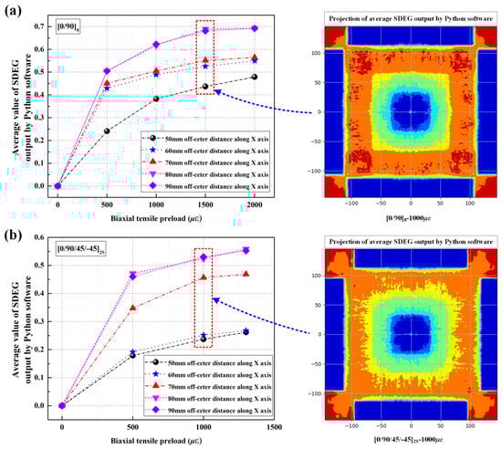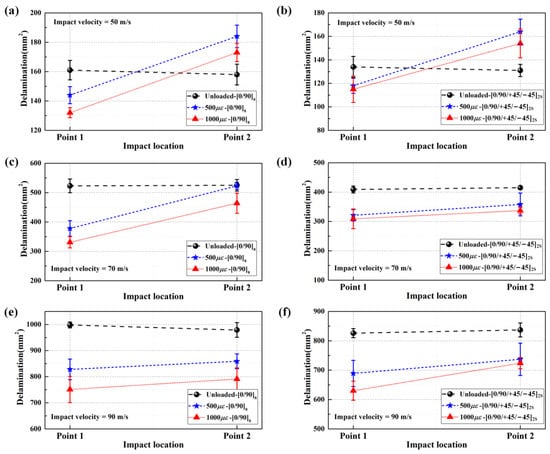 Both experimental and numerical results showed that when impacting the near-edge location at impact velocities of 50 m/s, preloaded CFRP laminated plates present more delamination areas than unloaded targets. However, by increasing the impact velocity from 50 m/s to 70 m/s, the preloaded CFRP laminated plates show fewer delamination areas in comparison to unloaded targets, which can also be found in the case of impacting the near-edge location of CFRP laminated plates at the impact velocity of 90 m/s. Figure 17a shows the numerical delamination areas of [0/90]8 plates under various biaxial tensile preloads (0 , 500 , and 1000 ) when impacting different positions at four different impact velocities (30 m/s, 50 m/s, 70 m/s, and 90 m/s). The preloaded targets present relatively fewer delamination areas at the near-edge location than unloaded targets when the impact velocity is increased to 70 m/s and 90 m/s, which stands in sharp contrast to the case at impact velocities of 30 m/s and 50 m/s. Assuming that the stiffening region of the preloaded CFRP laminated plate is the distribution range and that the delamination areas of the preloaded targets are less than those of unloaded targets, it can be seen that the stiffening regions constantly expand their scopes with the increase in the impact velocity. For example, the stiffening region of the 500 preloaded target expands its scope from the 30 mm off-center distance to 43 mm off-center distance by increasing the impact velocity from 30 m/s to 50 m/s. In addition, when suffering the 70 m/s impact loading and 90 m/s impact loading, the delamination areas of the preloaded targets are less than those of the unloaded targets at all eight impact locations from the center location to the 70 mm off-center distance. This means that the stiffening regions for both the 500 and 1000 preloaded targets expand their scope to all impact locations.