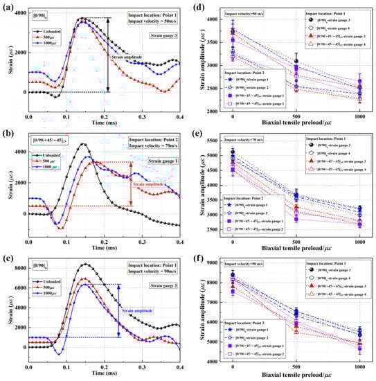 In-plane strain histories and strain amplitudes of CFRP laminated plates under various biaxial tensile preloads; (a–c) typical in-plane strain histories at impact speeds of 50 m/s, 70 m/s, and 90 m/s; (d–f) strain amplitudes calculated from in-plane strain histories at impact speeds of 50 m/s, 70 m/s, and 90 m/s.
