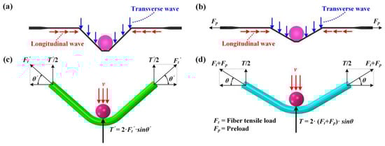 Enhancement mechanism of resistance to out-of-plane displacement for CFRP laminated plates when applying in-plane tensile preloads; (a,b) “V” shape caused by longitudinal wave and transverse wave with and without tensile preloads; (c,d) bending degree of plates with and without tensile preloads.