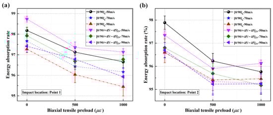 Energy absorption rates of CFRP laminated plates under various biaxial tensile preloads at impact speeds of 50 m/s, 70 m/s, and 90 m/s; (a) energy absorption rates when impacting point 1; (b) energy absorption rates when impacting point 2.