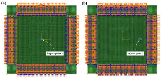 Mesh for L × W = (300 × 300) mm2 laminated plate; (a) impact on point 1 (center location); (b) impact on point 2 (near-edge location).