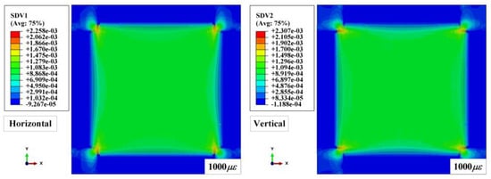 In order to continuously simulate the impact process of the composite under preloading conditions, the restart analysis function was employed to realize a preloading step followed by an impacting step in sequence. Firstly, a dynamic explicit step was established to apply in-plane tensile preloads on the laminated plate. In this step, the displacement, defined by the smooth step amplitude curve, was applied to all nodes in the regions that connected with the loading blocks to avoid the influence of an inertia force caused by the discontinuous loading rate [37]. Figure 10 shows the in-plane strain distributions along the horizontal and vertical directions for [0/90]8 laminated plates under 1000 biaxial tensile preloads. The strain distributions of the impact regions are almost smooth and uniform, indicating that the proposed method is feasible and efficient. After checking the value of the biaxial in-plane tensile pre-strains, the following impacting step was conducted based on the calculated result from the previous preloading step by employing restart analysis in the ABAQUS explicit solver.