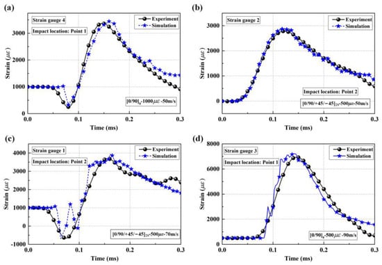 Comparison of typical strain histories between experiments and simulations; (a) strain gauge 4 on [0/90]8 plate; (b) strain gauge 2 on [0/90/+45/−45]2S plate; (c) strain gauge 1 on [0/90/+45/−45]2S plate; (d) strain gauge 3 on [0/90]8 plate.