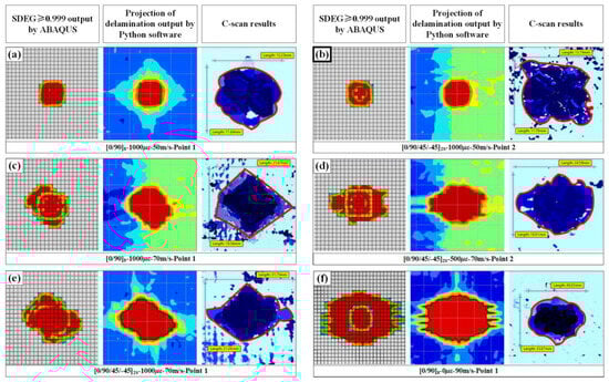 Comparison of typical delamination between experiments and simulations; (a) impact on point 1 of 1000 με preloaded [0/90]8 plates at speeds of 50 m/s; (b) impact on point 2 of 1000 με preloaded [0/90/+45/−45]2S plates at speeds of 50 m/s; (c) impact on point 1 of 1000 με preloaded [0/90]8 plates at speeds of 70 m/s; (d) impact on point 2 of 500 με preloaded [0/90/+45/−45]2S plates at speeds of 70 m/s; (e) impact on point 1 of 1000 με preloaded [0/90/+45/−45]2S plates at speeds of 70 m/s; (f) impact on point 1 of unloaded [0/90]8 plates at speeds of 90 m/s.