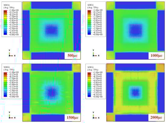 Figure 13 shows the numerical delamination areas of CFRP laminated plates under various biaxial tensile preloads when impacting different positions at velocities of 50 m/s, 70 m/s, and 90 m/s. As shown, the delamination areas gradually increase when moving the impact location from the center to the near-edge location. The [0/90]8 and [0/90/+45/−45]2S targets under 500 and 1000 show more delamination than unloaded targets when impacting the near-edge location at 50 m/s. Figure 14 shows the stiffness degradation of [0/90]8 CFRP laminated plates under various biaxial tensile preloads. Using the toggle global translucency function in ABAQUS/Explicit shows that the CFRP laminated plates present different degrees of interface stiffness degradation at different positions when applying various biaxial tensile preloads. The interface stiffness degradations at the near-edge location are significantly higher than those at the center location (almost no interface stiffness degradation), which results in the interfacial strengths of the laminated plates at the near-edge location being weaker than those at the center location. Thus, both the experimental and numerical results indicate that the preloaded targets generate more delamination at the near-edge location in comparison to the center location when suffering impact loading.