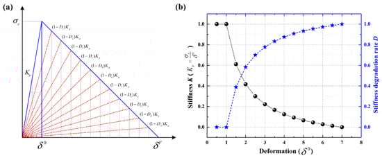 Schematic diagram of stiffness degradation for interface layer based on bilinear constitutive model; (a) bilinear constitutive model; (b) stiffness degradation for the interface layer.