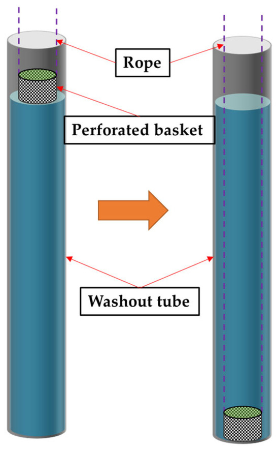 Testing of the washout loss (Mloss) and pH value of the UNC was conducted in accordance with USA CRD C61 [34] and China code DL/T 5117 [35]. The anti-dispersion testing device is shown in Figure 1, in a tube with water of a 1.7 m height. A fresh concrete sample in a perforated basket freely fell to the bottom of the tube and was left to stand for 15 s, then the sample was retrieved at a constant speed of 0.5 m/s, and the mass loss due to the washout was measured. The washout losses reported are the cumulative of three tests of the sample in the water. Ten equal parts divided from 500 g of fresh UNC were subsequently placed into an 800 mL beaker filled with distilled water and stood for 3 min, and the water sample from the top layer was taken for the testing of the pH value. The compressive strength (fcu) of the UNC was measured at the curing ages of 7 days and 28 days using cubic specimens with dimensions of 100 mm, according to the specification of China code JGJ/T283 [33].