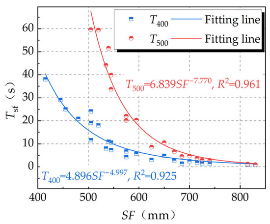 Regarding the workability of the fresh concrete, the slump and slump-flow ranged within 240–280 mm and 415–830 mm, respectively. The flow times T400 and T500 varied within 1.0–38 s and 0.9–59.6 s, respectively. As shown in Figure 2, a negative correlation was presented between the flowability and the flow time, and the difference between T400 and T500 became larger when the flowability was smaller. This was because of the smaller flowability of the fresh concrete, along with a higher plastic viscosity and yield stress [36,37]. A decrease in the flowability of the fresh concrete resulted in a significant prolonging of the flow time, which reached a larger slump-flow [38,39].