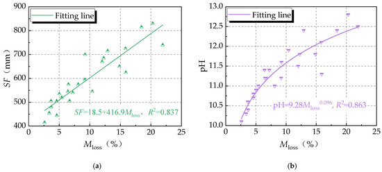 Figure 3. Relationships of performance indicators of UNC: (a) slump flow and washout loss; and (b) pH value and washout loss.