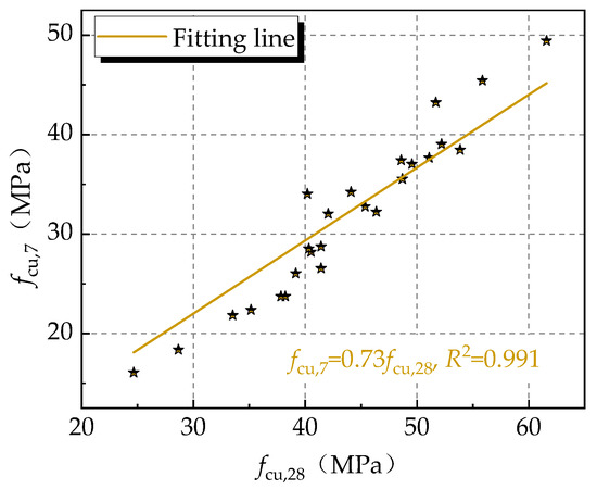 For the compressive strength of the UNC, a similar variation was presented at the curing ages of 7 days and 28 days. As shown in Figure 4, a formula can be obtained using a linear fitting for the compressive strengths at 7 days and 28 days, with a ratio of 0.73 and a correlation coefficient of 0.91. This was similar to the strength development of the conventional concrete at the curing age from 7 days to 28 days [22,40]. No. 1 UNC provided the highest compressive strengths at 7 days and 28 days, denoted as A1B1C1D1E1F1, with strengths reaching 49.4 MPa and 61.6 MPa, respectively.