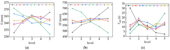 Table 5 shows the results of the range and variance calculations for the various workability indicators. It can be seen that the S, SF, and T400 sensitivity are ranked in the order of DACBEF, ADCFBE, and ADECFB from high to low. The factor with the largest range in slump was the dosage of dispersant D, followed by the water–binder ratio factor A. The factor with the largest range in the spread was the w/b factor A, followed by the dosage of dispersant D. The factor with the largest range in flow time T400 was the water/binder ratio factor A, followed by the dosage of dispersant D. Factors B, C, E, and F had relatively small sensitivities to the three performance indicators. A higher slump and slump-flow induced a lower flow time. Therefore, the optimal combinations of the slump, slump flow, and flow time were A5B3C1D1E3F3, A5B3C5D1E4F5, and A5B4C1D1E3F1.