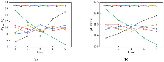 Figure 6. Various trends in the mean values ki of anti-dispersion at different factor levels: (a) Mloss; and (b) pH value.