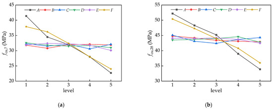 Figure 7. Various trends in the mean values ki of compressive strength at different factor levels: (a) fcu,7; and (b) fcu,28.
