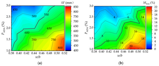 Figure 8. Comprehensive impact of test factors on workability and anti-dispersion performance: (a) effect of w/b and PADA on SF; and (b) effect of w/b and PADA on Mloss.