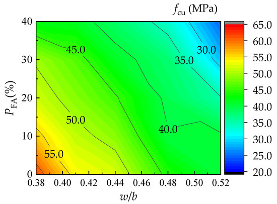 f cu , 28 = 58.5 w / b 36.3 P FA 86.2 ( w / b ) 2 + 23.6 ( P FA ) 2 23.2 ( w / b × P FA ) 2 + 93.8