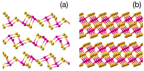 As mentioned above, these two groups of materials are isoelectronic but form very different structures. In the orpiment structure, covalently bonded fragments are formed with all elements satisfying the 8–N rule [], i.e., chalcogen atoms are two-fold coordinated and pnictogens are three-fold coordinated. The interaction between covalently bonded blocks is usually described as being of van-der-Waals type. Heavier chalcogenides and pnictides typically form a tetradymite structure based on quintuple layers (QLs) with the stacking sequence of C-P-C-P-C, where C stands for chalcogens and P corresponds to pnictogens. The outermost chalcogen atoms in the quintuple layer are three-fold coordinated, with all other atoms being octahedrally coordinated. In both cases, the 8–N rule is violated.