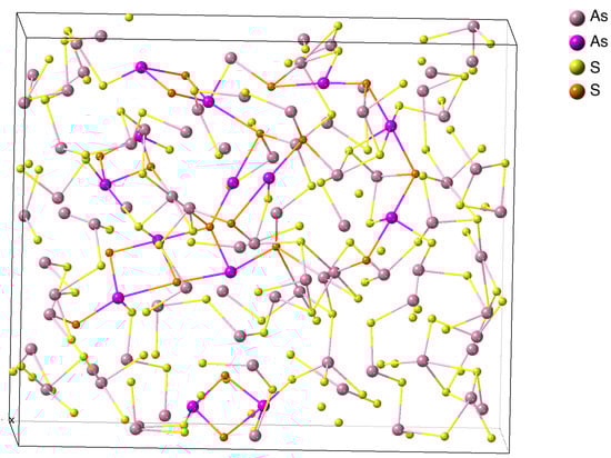 In Figure 2, we show an in silico amorphous structure obtained using the procedure described above. One can see that, indeed, in addition to units characteristic of the crystalline orpiment phase, linear atomic fragments (in some cases as long as five atoms) and As-S-As-S square rings reminiscent of the tetradymite phase are formed. (The tetradymite fragments are shown in somewhat brighter colours in the figure). This result demonstrates the suitability of the proposed concept. Interestingly, such extended linear fragments were also found in the amorphous phase of []. It should also be noted that similar extended fragments, called hypervalent bonds, formed due to the presence of lone-pair electrons, were introduced by Dembovsky and Chechetkina [] as major defects in chalcogenide glasses.