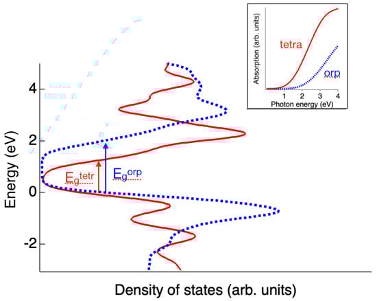 Calculated densities of states around the Fermi level for the orpiment and tetradymite phases demonstrate a significantly smaller band gap for the tetradymite phase. The inset shows the simulated absorption edges for the two phases with that for the tetradymite phase shifted to smaller energies, which corresponds to darkening.