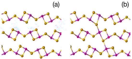 Schematics of the photo-induced structural change in the glass. Arsenic atoms are shown in violet and S atoms are yellow. (a)—ground state, (b)—photodarkened state.