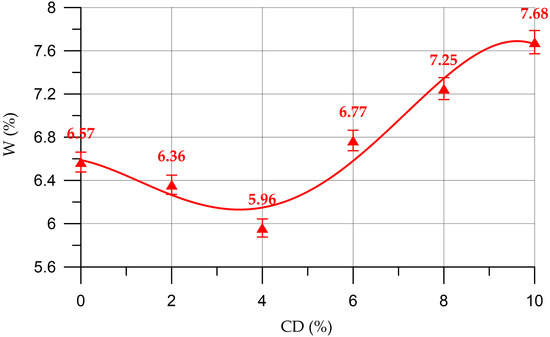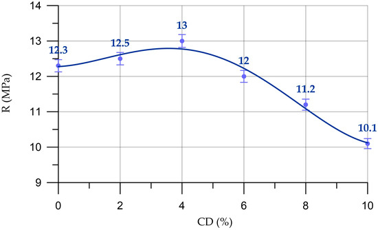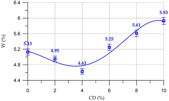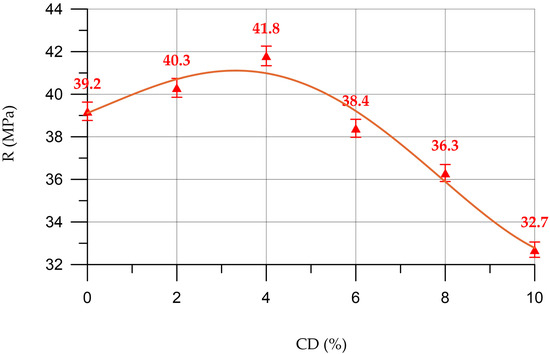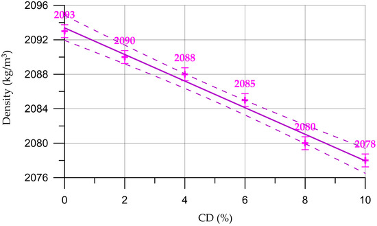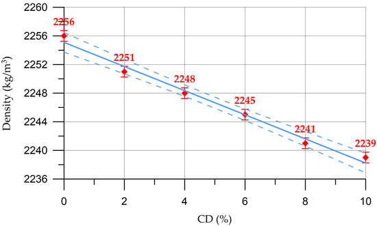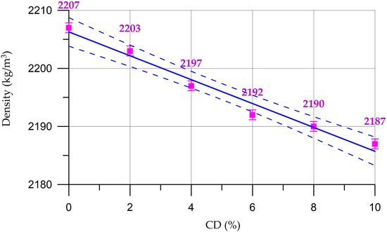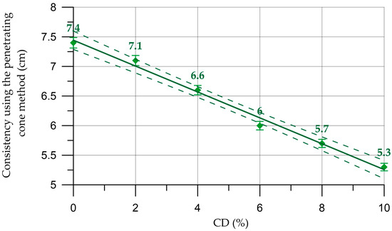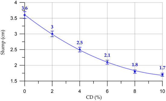 | Characteristics | ∆ (%) with CD Content Introduced Instead of Part of the Cement (%) | |||||