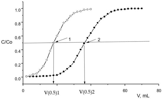 The calculated values of metal distribution coefficients using frontal loading curves; C/C0 is the ratio of metal concentrations in eluate and feed solutions [40]. 1 and 2 are frontal curves for two different metals.