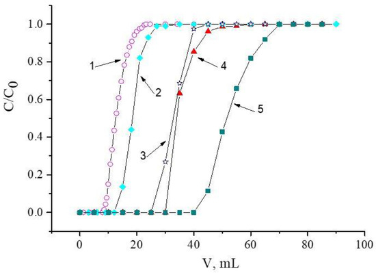 Frontal loading curves of Nd(III), obtained with the following resins: 1 is for SIR 1; 2 is for SIR 2; 3 is for SIR 3; 4 is for SIR 4; 5 is for SIR 5. The SIR content is 600 ± 3 mg; the concentration of Nd(III) in the feed solution is 260.5 ± 0.3 mg/L; the flow rate is 1.0 mL/L.