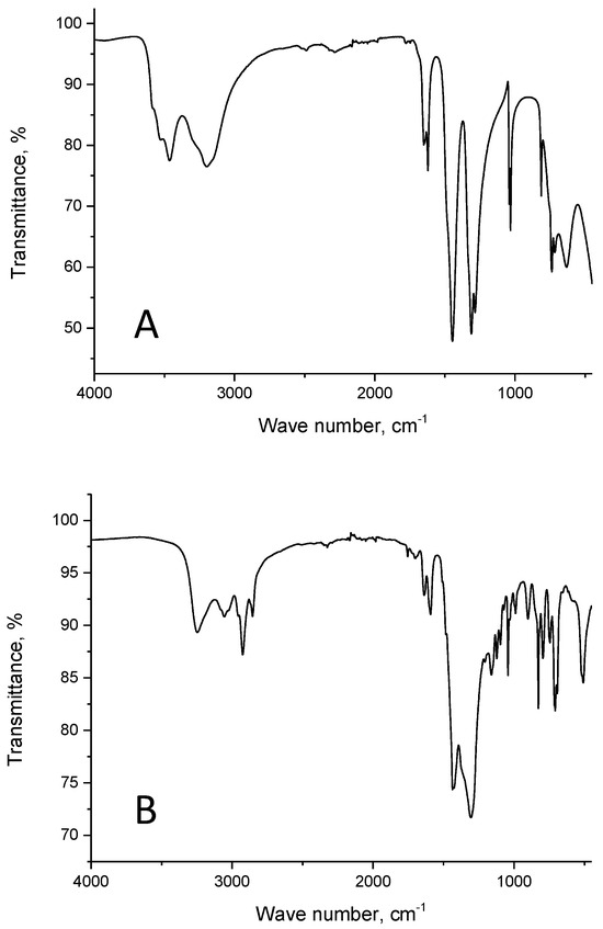 The IR spectra obtained with a resolution of 1 cm−1 and 32 scans were recorded at room temperature in the range of 450–4000 cm−1 on a Perkin-Elmer “Spectrum Two” FT-IR spectrometer (Waltham, MA, USA) with an ATR attachment.