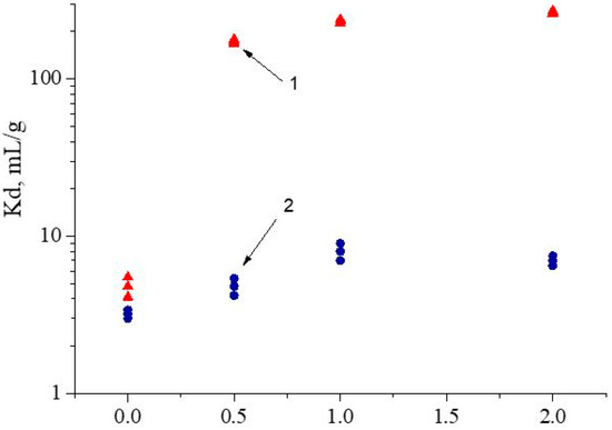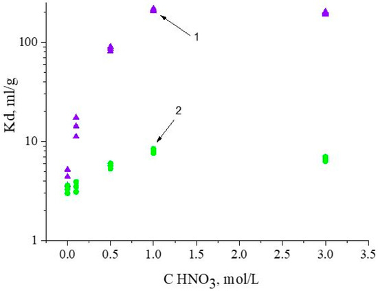 Under these conditions, the values of Kd for Fe(III) and Nd(III) are 12 ± 4 and 114 ± 7, respectively. Thus, the value of the separation factor of Nd(III)/Fe(III) for SIR 6 is 9 ± 3. At the same time, the value of the separation factor of Nd(III)/Fe(III) for SIR 5 in NH4NO3 of 1.0 mol/L is 28 ± 2. Therefore, in these conditions, with SIR 5, the separation efficiency of Nd(III)/Fe(III) exceeds SIR 6 almost three times.