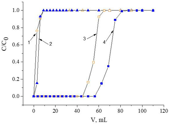 The chromatographic column packed with 600.8 ± 0.7 mg of SIRs (Table 3) was washed with a peristaltic pump with a HNO3 solution of a chosen concentration with a flow rate of 1.0 mL/min for 1.0 h. Then, Nd(III) or Fe(III) solutions with concentrations of 580.5 ± 0.5 mg/L and 260.5 ± 0.3 mg/L, respectively, were constantly passed through the column until SIR saturation was completed with a flow rate of 1.0 mL/min. Concentrations of Nd(III) and Fe(III) in eluates which left the column were automatically determined using the spectrophotometric method. The frontal loading curves shown in Figure 2 were used to calculate the values of distribution coefficients and the capacity of SIRs. Experiments were performed at room temperature.