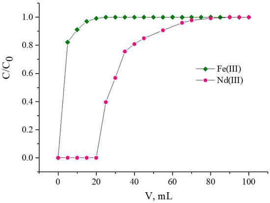 Fe(III) is completely stripped by passing through the column of 8.0 mL of NH4NO3 with a concentration of 1.0 mol/L, whereas the desorbate obtained contains a small amount of Nd(III) (0.547 mg). The main amount of Nd(III) is stripped by distilled water, and this desorbate is practically important. In our experiment, 6.1 mg of Nd(III) of purity > 99.5%, which is 98.5% of the total amount of loaded Nd(III), was obtained. From the obtained product solution, Nd(III) may be precipitated by (NH4)2CO3 or (NH4)2C2O4 [56]. Fe(III), as well as other metals of NdFeB magnets, can be precipitated from ammonium desorbate by adding Na2CO3. Thus, the production of solid precipitations at both stages of separation allows waste from the separation process to be reduced, which makes it environmentally friendly. Additionally, this approach to the separation of Fe(III) and Nd(III) does not use inorganic acids, which prevents the corrosion of equipment.