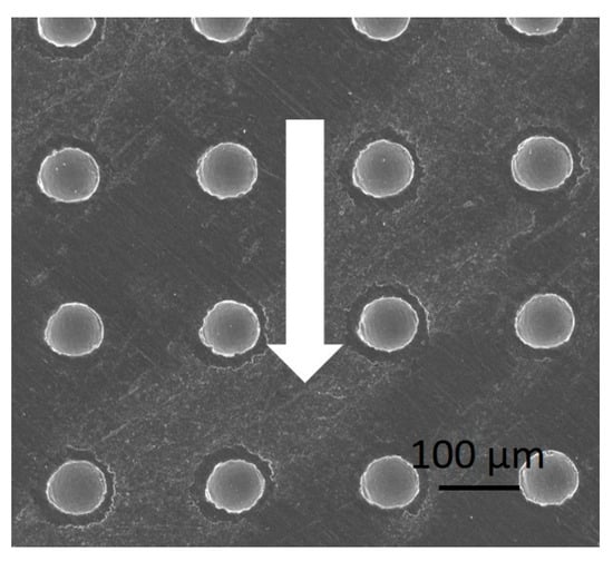 Tribological testing—A TRIBOtechnic friction-testing tribometer in the ball-on-flat contact configuration under a reciprocating sliding motion was employed for the tribological tests. Tribological testing was conducted under ambient conditions, with the following testing parameters: normal load of 5 N, corresponding to a nominal contact pressure of 600 MPa; average sliding speed of 5 mm/s (frequency 0.25 Hz and amplitude 10 mm); and a total sliding distance of 1 m (sliding time ~200 s). A 100Cr6 bearing-steel ball (10 mm diameter) was used as a stationary counter-body and loaded against a laser-textured Ti6Al4V disc. Sliding was performed along the dimple-texturing pattern as shown in Figure 1. Prior to testing, both contact bodies were cleaned in an ultrasound bath with ethanol and then dried in air. For lubrication, a drop of oil was applied to the surface, enabling boundary/mixed lubrication throughout the test. Each test was repeated three times, which allowed us to calculate the average steady-state coefficient of friction, COF (last 100 s). Wear tracks were analyzed with the SEM and the optical 3D microscope to determine the width and the depth of the wear scars for a calculation of the wear volumes.