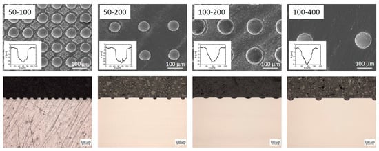 SEM images (15.0 V, X200, WD 36.2) of analyzed dimple-laser-textured Ti6Al4V surfaces, 50–100, 50–200, 100–200, and 100–400; and below, the corresponding light microscopy images. The first number labels the dimple width, while the second number indicates the dimple-to-dimple distance. The inset in each SEM image shows the depth profile of the dimples.