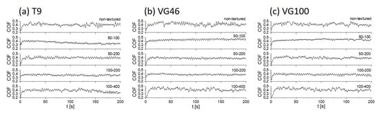 Coefficient-of-friction curves for non-textured and all laser-textured Ti6Al4V samples (50–100, 50–200, 100–200, and 100–400) under T9 (a), VG46 (b), and VG100 (c) oil lubrication.