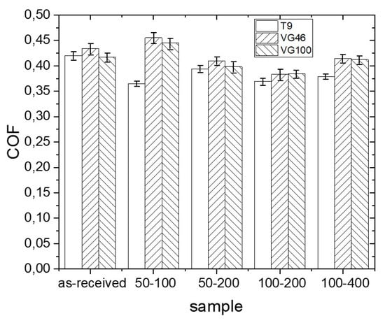 In the following tests we used three types of synthetic oils with different viscosities (Table 1): T9, VG46, and VG100. Figure 3 presents typical coefficient-of-friction curves for the non-textured and all-laser-textured Ti6Al4V samples (50–100, 50–200, 100–200, and 100–400) under T9, VG46, and VG100 oil lubrication. For the non-textured samples, we can observe relatively stable friction during the sliding experiment in all three oils, regardless of their viscosity. There is, however, a slight difference in the steady-state coefficient of friction. The initial and steady-state COF for T9 is around 0.42, while for VG46 and VG100 they are slightly higher, around 0.44 (Figure 4 and Figure 5).