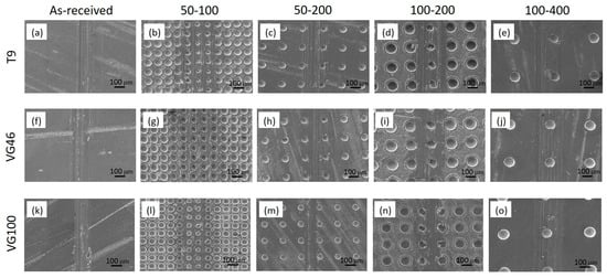 When analyzing wear, the wear of the counter-body, i.e., the100Cr6 ball, was below the detection limit due to the more-than-two-times-higher hardness of the 100Cr6 compared to the Ti6Al4V material. Therefore, all the wear was measured on the Ti6Al4V surface, regardless of the texturing pattern and oil lubricant. Figure 6 presents SEM images of the wear scars of the non-textured and all-laser-textured Ti6Al4V samples (50–100, 50–200, 100–200, and 100–400) under T9, VG46, and VG100 oil lubrication.