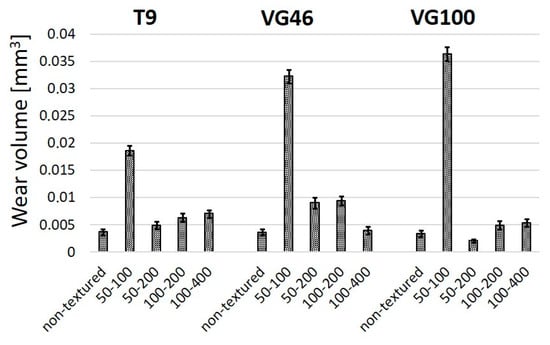 Wear volumes of non-textured and laser-textured Ti6Al4V surfaces under T9/VG46/VG100 oil lubrication.