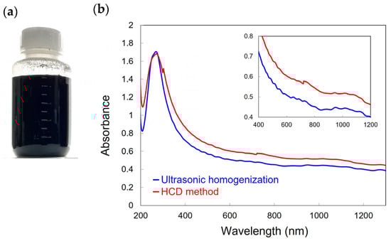 (a) Photograph of SWCNT solution dispersed via the HCD method and (b) optical absorption spectra of SWCNT solutions after ultracentrifugation. The inset shows enlarged spectra at the visible and NIR range (400–1200 nm).