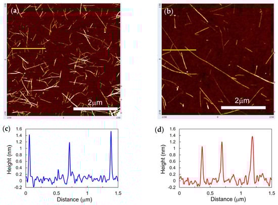(a,b) AFM images SWCNTs on SiO2/Si, and (c,d) the height profiles for yellow lines specified in the images. SWCNTs were dispersed by using (a,c) ultrasonic homogenization and (b,d) HCD method.