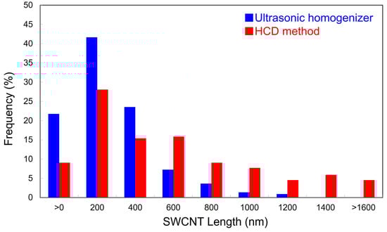 Histogram showing the length distributions of SWCNTs dispersed by using the ultrasonic homogenization (blue) and HCD method (red) with the class interval of 200 nm.