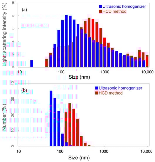(a) Light-scattering intensity and (b) particle size distributions in the SWCNT dispersion prepared by ultrasonic homogenizer (blue) and HCD method(red).