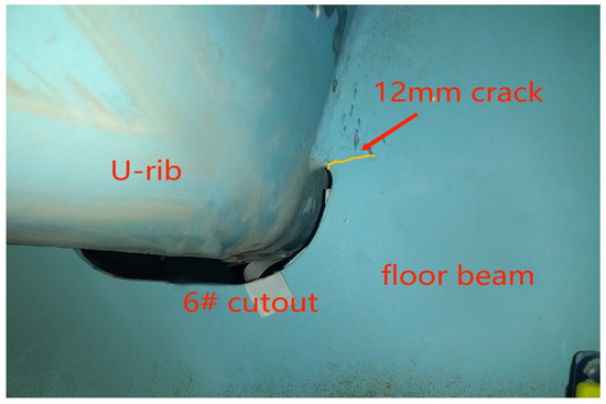 To summarize, the fatigue cracking first appears in the fatigue-vulnerable part, which is determined by the fatigue stress amplitude, the number of actions, and the resistance of structural details, and then expands when enough energy can be provided around it, which is why the control part is used to determine the fatigue performance of an orthotropic steel deck. There are geometric discontinuities, local stress concentrations, hot-spot stresses, and welding defects at the opening of the diaphragm and the end of the connecting weld between the U-rib and diaphragm. They are fatigue-sensitive parts, which are greatly affected by the relative horizontal displacement. They are high-incidence areas of fatigue cracks, with occurrence rates as high as one/three or more. They are the control parts of fatigue performance of orthotropic steel deck [19].