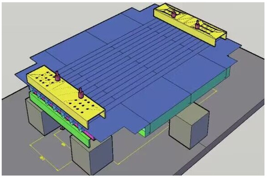 The supporting project was a suspension bridge. In the design process of the steel-deck model, the supporting project was simulated according to the elastic-support continuous beam [18]. After the overall analysis, the steel box girder with 16 m standard section was selected and analyzed by the elastic-simple-support finite element method. In the light of the analysis results of the segmental-steel box girder and the local characteristics of the orthotropic-plate fatigue details which are only sensitive to wheel load, a simplified panel segment model was established on the scale of 1:2, shown in Figure 1 and Figure 2. As the above analysis shows, the boundary condition of the panel model was set as simply supported at both ends of the longitudinal bridge. One end constrained three translational degrees of freedom of the nodes, the other end only constrained the vertical displacement of the nodes, and the transverse bridge only restricted the downward-displacement on both sides. To summarize, the calculation results were in good agreement with the original bridge type. A cutout fatigue crack was found in the fatigue test model, as shown by the yellow wavy line in Figure 3. The crack’s study is outlined below.