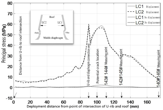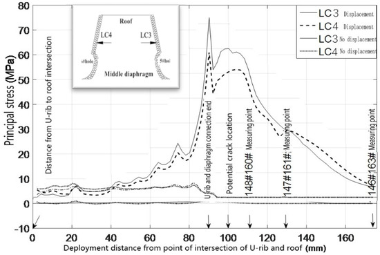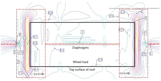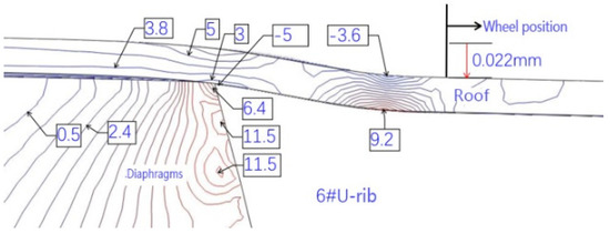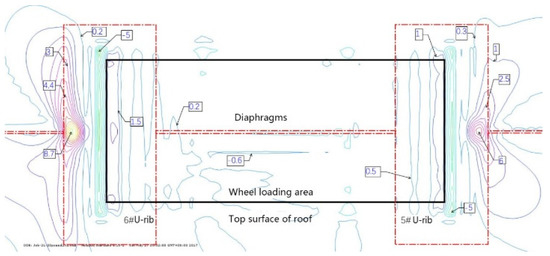 The fatigue crack in the roof plate is always related to the connection among the roof, U-rib, and diaphragm [23,24]. The contour lines of the upper and lower surfaces of the roof show that the upper and lower surfaces of the roof are compressive stresses within the range of the wheel load. Outside of the wheel trace, the principal stress at the top of the roof is −5 MPa, which indicates that the roof is mainly under pressure, and the principal stress at the bottom of the corresponding roof is 9.2 MPa, which indicates that the roof is mainly under tension. At the junction of the diaphragm and the sixth U-rib, the main stress at the top of the roof is about 9 MPa, which means that it is mainly in tension. At the bottom of the corresponding roof, the main stress is −5 MPa, which indicates that it is mainly in compression. This shows that the roof between the sixth U-rib and the wheel trace is in a complex repeated-bending state, and the principal stress amplitude is about 14 MPa. Although it is not high, the compressive stress is so high that the displacement amplitude is about 0.022 mm (seen in Figure 11). From the above analysis, it can be seen that the fatigue-resistant ability of the plate is weak, and the plate is sensitive to external deformation. Hence, enough attention should be paid to the fatigue problem. Due to the fact that there are cracks in the roof, rainwater will be immersed into the U-rib, resulting in corrosion and aggravating fatigue. Such cracks are difficult to find. Once found, it is too late.