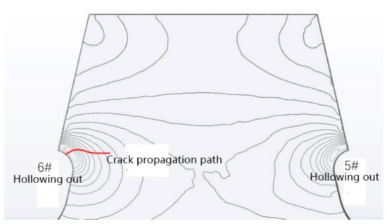 Contour of principal stress and crack-propagation path on the right side of 6# arc opening.